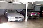 Underground gated parking, thank God. My Toyota Camry "Bluebelle" is on the left; Steve's Saab 9-5 convertible "Sven" is on the right. |